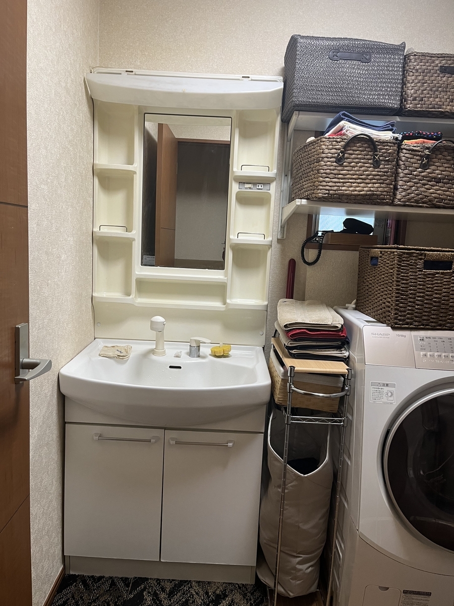 洗面台のとこだけ荷物片付けてある状態でもこのゴチャゴチャ感。カゴやば😂やはり今でもそっとギュッと目を閉じたくなります😂w